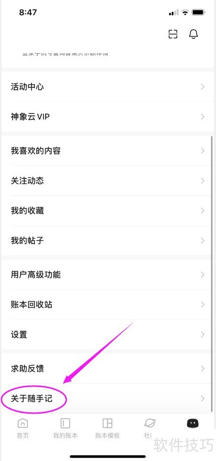 2、 然后进入我的页面,点击左下角关于随手记。
