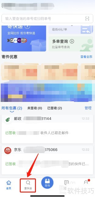 1、 首先打开快递100主界面,点击下方的【查快递】