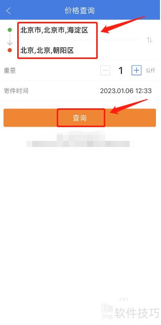 3、 跳转到的价格查询界面,输入发送地和目的地,然后点击【查询】按钮