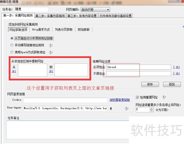 3、 设置列表分页获取,3个地方分别是:分页源代码前面和后面还有中间位置。这一步用于获取列表页面链接,因为有34个列表页面。设置完保存。4网址获取选项,这一步用于获取列表页上面文章页的链接,根据自己需要设置需要截取的部分和根据网址的结构设置包含与不包含某些字符。为空即没限制,设置完保存。