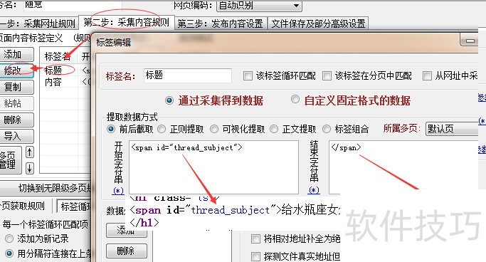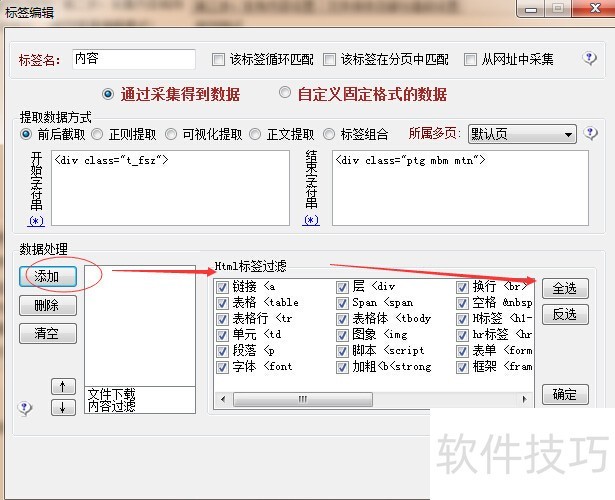 7、 修改内容采集规则,跟标题规则差不多,也是源代码里面找到内容的前后代码。这里内容会有一些其他html标签,所以得添加一个html标签排除的规则。