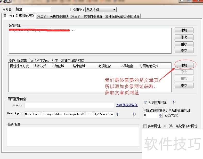 1、 第一步采集网址,下载好火车头采集器后打开,新建一个任务,任务名随意。把需要采集的网站文章列表页网址添加到起始网址。从图中看出该列表页有34页,每页有N篇文章。2列表页会一级网址,添加多级网址获取,从而获取二级网址(文章页网址)