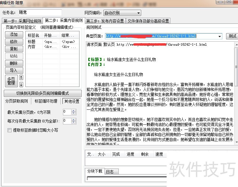 5、 设置好链接采集规则后,可以测试网址,看测试结果调整规则。看图可以看到采集链接规则从起始链接到全面列表页再到列表页上的文章页链接都已经成功采集。6第二步是采集内容,首先修改标题规则,在页面源代码里面找到标题的代码,把标题前后代码负责过去截取出标题。保存。