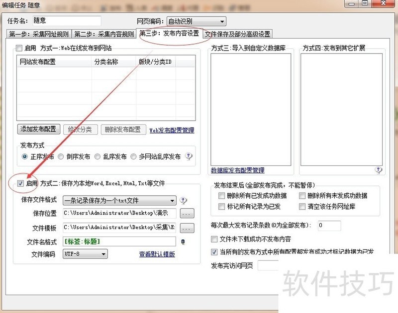 10、 然后选择方式二,把每一篇文章都分别记录到一个txt文本,保存位置自己选择,模板选择刚刚做好的导出模版.保存的文件名用文章标题为命名。其他默认,保存。