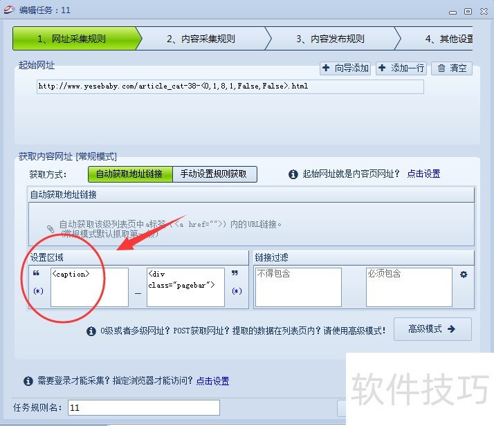 4、 填写好这2个规则后,点击下面的“确定”按钮。那么我么就完成第一步“起始网址”的写法规则。..“获取方式”是默认的“自动获取地址链接”,这个就不要去修改它了。我们只需要填写好“设置区域”写法规则是:..(1)点击你要采集的栏目页面——单击鼠标右键——点击”查看源代码“..(2)在代码里找到栏目页面的内容,选定采集栏目页内容的起始代码标签,这个代码标签可以随意选,但前提条件是,整个代码中只有1个这样的代码标签。不能是2个以上,2个以上的不能用。..(按键盘ctrl+F健,输入这个代码标签,就出来该网页有多少个这样的标签,1个才能用,2个以上不能用。要找到唯一 一个代码标签)..用同样的方法,找栏目页面内容的结束代码标签,这个标签一般都是在该栏目内容的结束后面,只要是在改内容结束后面的代码都可以用来作结束代码标签。当然啦,这个代码标签只能由1个,不能出现2个。如图:
