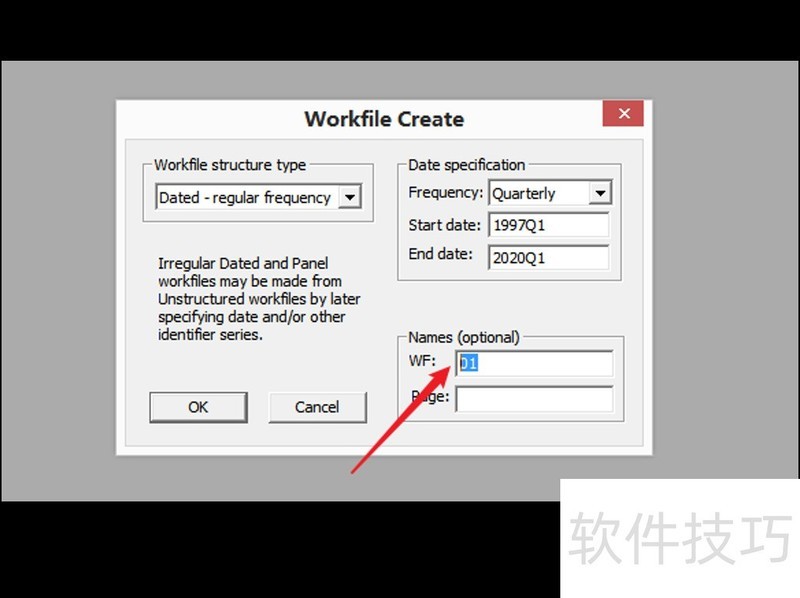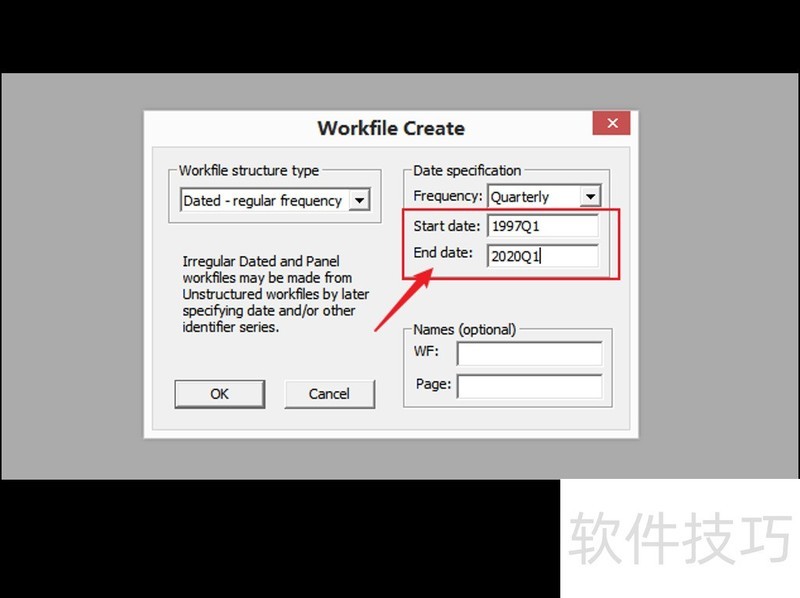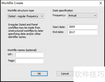2、 Step1:在workfile structure type选择“dated - regular frequency”Step2:填写年度信息start date:2009;end date:217(注:根据自己数据进行填写)