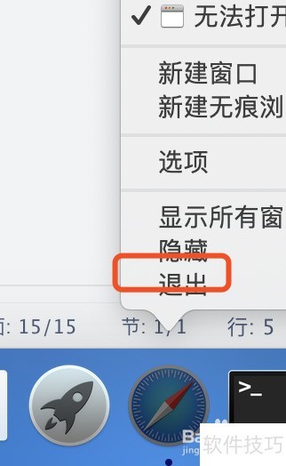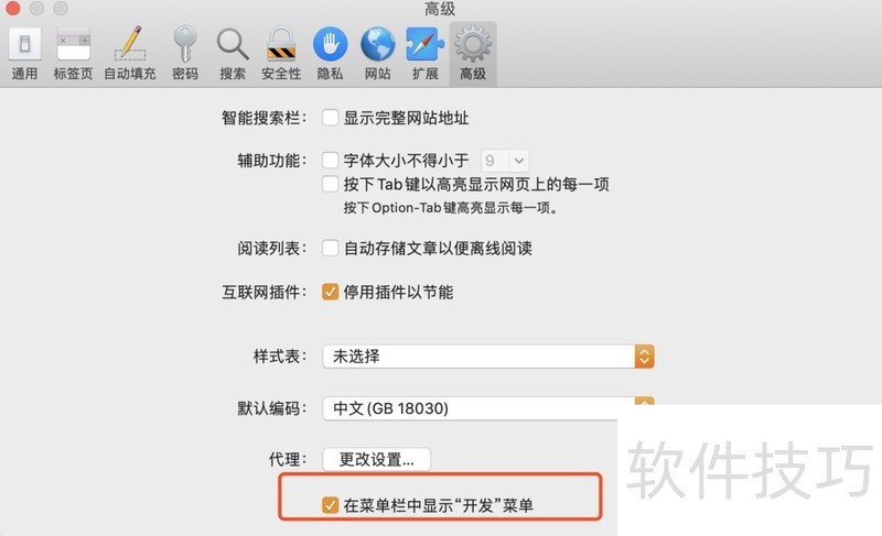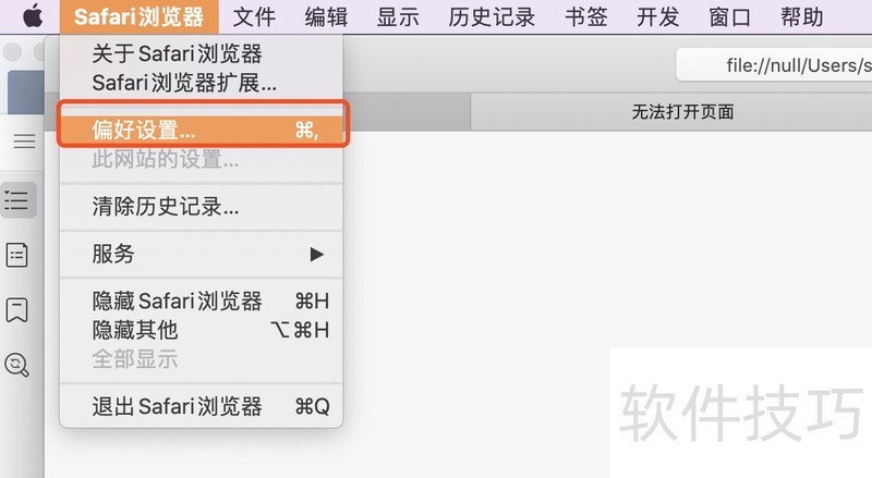 4、 打开safari浏览器找到 偏好设置 选项 勾选,在菜单栏中显示?开发?选项