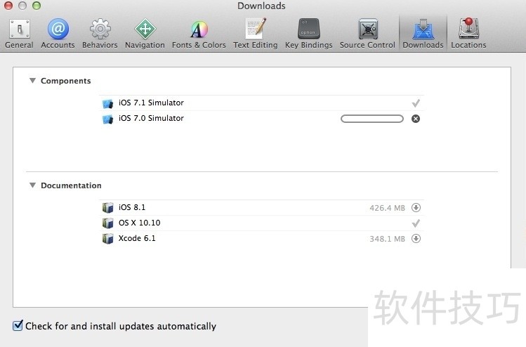 3、 选择download选项,如下图。可以看到components和documentation两项。components下方的ios7.1 simulator表示 7.1模拟器。documentation下方为开发文档。