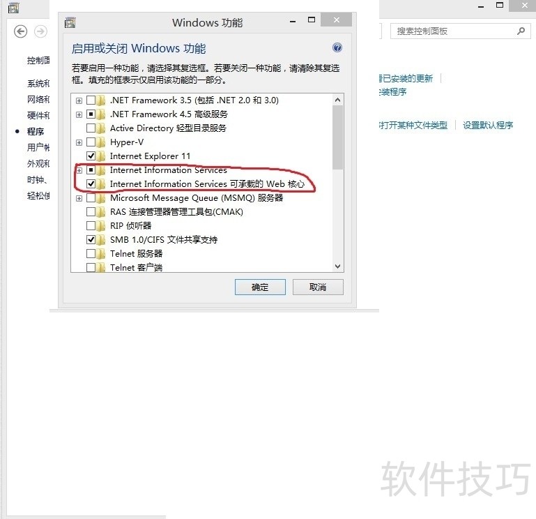 3、 从功能区可以看到关于iis的选项,共有两项,把这两项勾选,然后确定。