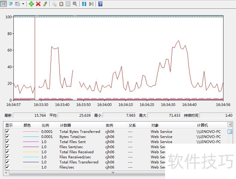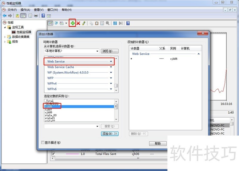 4、 在运行界面输入perfmon.msc,打开性能监视器;在性能监视器界面点击添加按钮,在添加计算器选择web service,选择需要巡检的网站。