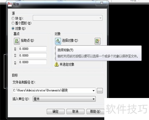 5、 在“写块”窗口,找到“对象”,然后下面有个“选择对象”。