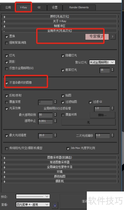 3、 我们在VR渲染器设置里,找到全局开关。在全局开关里,我们把“不渲染最终的图像”勾选了。我们只是渲染光子图不渲染最终的效果图,这里找不到的话,就点击打开专家模式。
