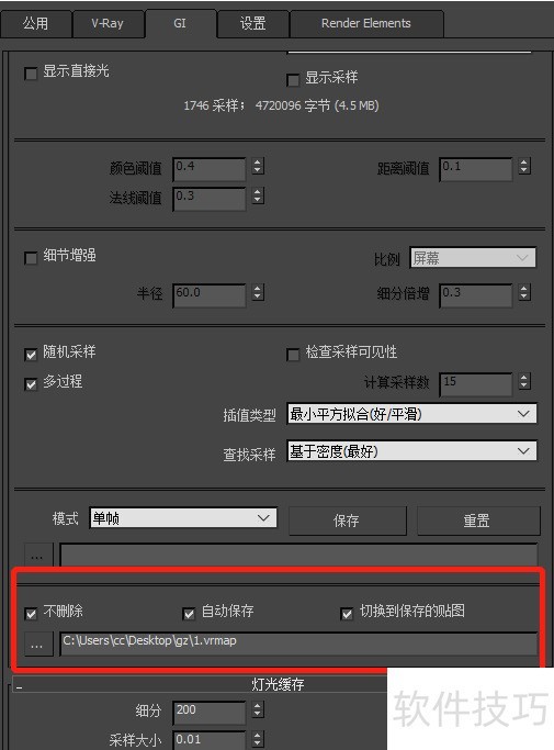 4、 我们找到GI设置(间接照明)。然后首次引擎选择发光图,二次引擎选择灯光缓存,如图所示。我们设置发光图预设为“低”,灯光缓存设置200就行。都是小图的设置参数设置光子图,大图(成品图)根据自己的来。5我们在光子图里打开高级或者专家模式,在保存位置设置不删除和自动保存,然后选择保存的位置,并且命名。这里我命名的“1”,具体的设置看图中红色区域。