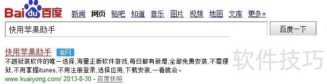 1、 网络“快用苹果助手”,由检索结果进入快用官网,在官网下载并安装快用苹果助手的win客户端