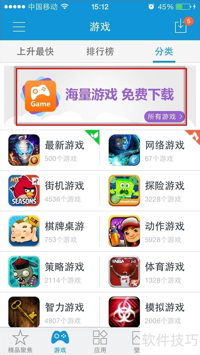 2、 切换至“分类”页面后,可以再次点击上方“海量游戏免费下载”的图片链接进入。