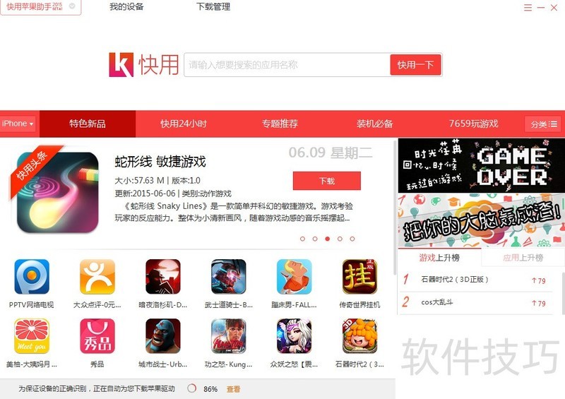 快用苹果助手为苹果用户提供诸多便利,从应用安装到文件查找,再到解决游戏闪退。无需越狱等繁琐步骤就能享受正版APP,是苹果手机实用的第三方管理软件。