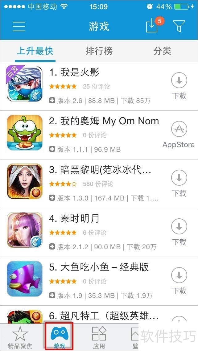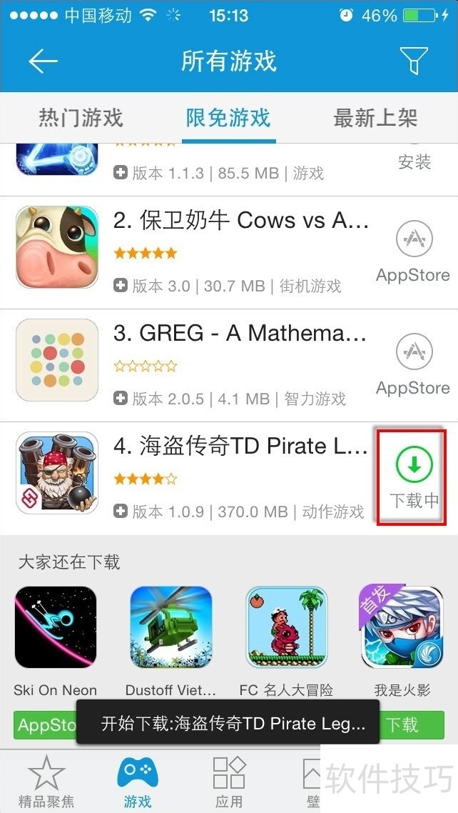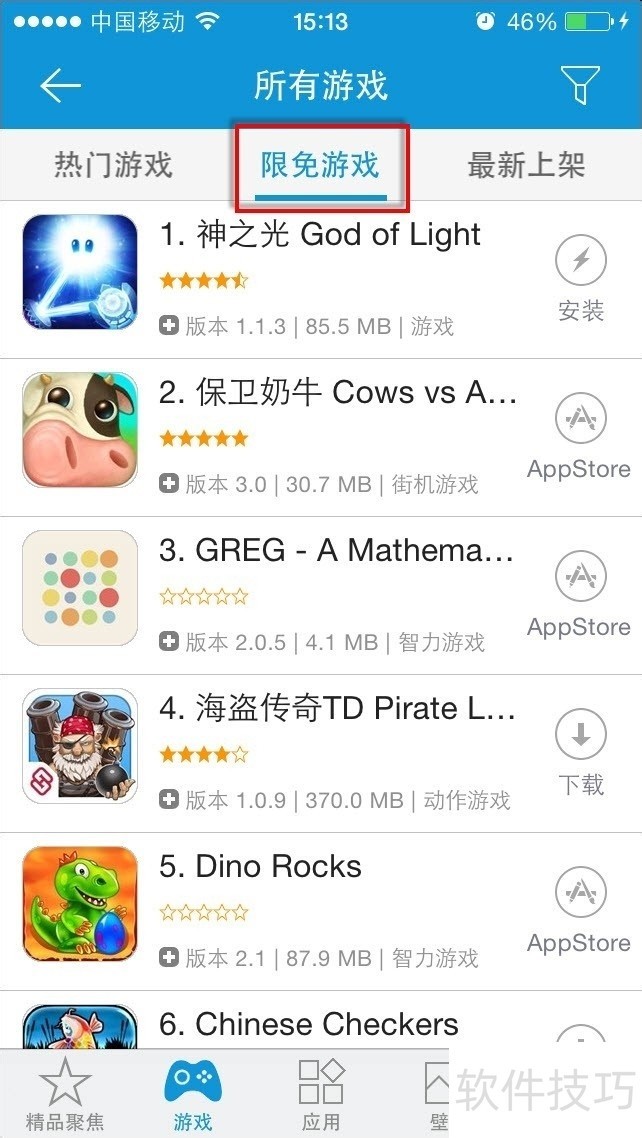 3、 在“限免游戏”频道下方即可看到KK苹果助手为我们准备的丰富游戏列表。可以切换至AppStore安装也可以直接在该界面下点击“下载”按钮。
