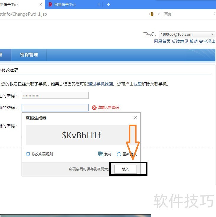 5、 生成一个随机密码,然后点击“填入”,按提示填写完整其他内容完成注册