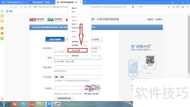 4、 把鼠标移到密码框内,单击鼠标右键,点击下拉菜单的“密码生成器”