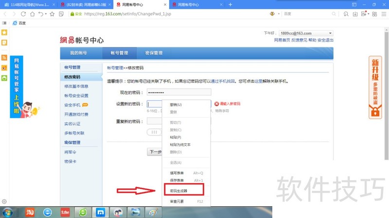9、 进入帐户中心,输入原密码后,把鼠标移到“设置新的密码框内”,单击鼠标右键,点击下拉菜单的“密码生成器”