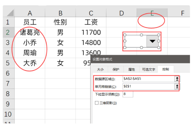 2、右键组合框,设置控件格式,选择数据源区域和链接单元格。