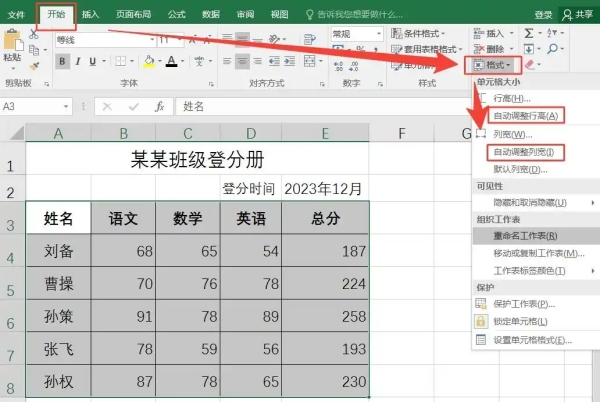 3、自动调整行列宽高:选中表格,依次点击“开始”、“格式”,选择“自动调整行高”或“自动调整列宽”。也可选中单元格,自动调整所在行或列。