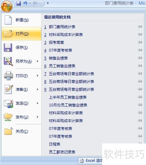 1、 ?“文件”菜单单击Excel工作界面左上角的Office按钮 ,可以打开“文件”菜单。在该菜单中,用户可以利用其中的命令新建、打开、保存、打印、共享以及发布工作簿。?