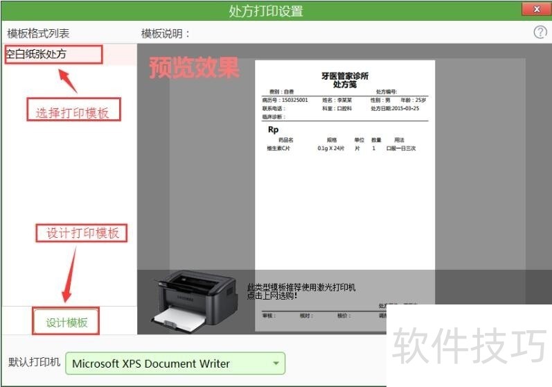 3、 在处方打印设置界面进行操作。选择好打印模板,进行模板设置。