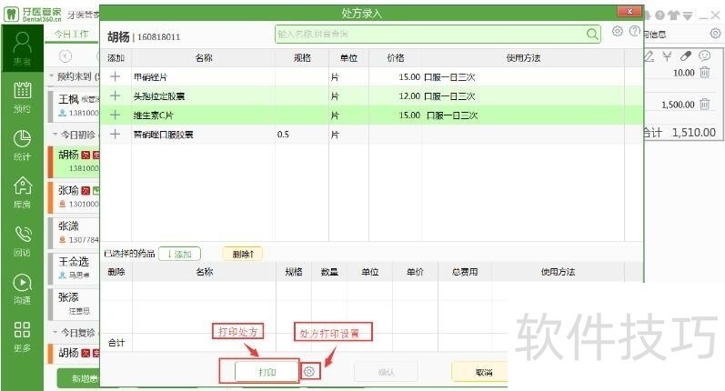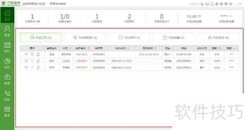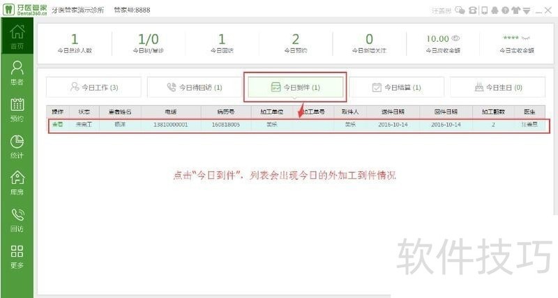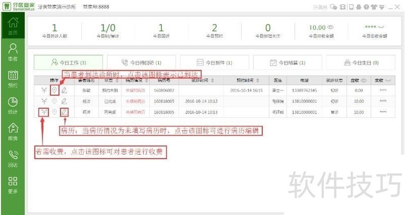 2、 “今日工作”统计的是【患者】中心的今日工作,点击该项可查看今日诊所的工作情况,可对今日就诊患者进行操作
