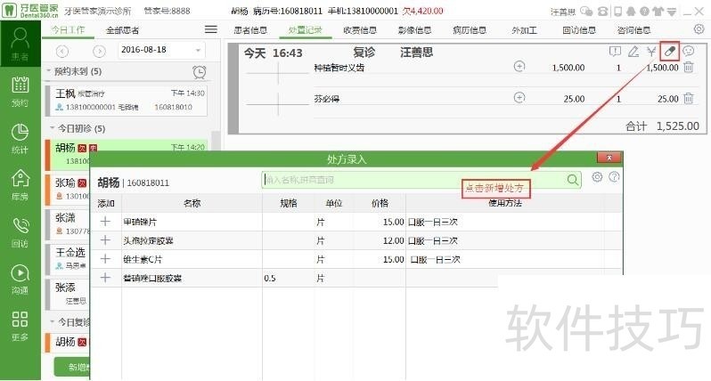 1、 点击患者-处置记录-开发方-进入处方录入界面。可以点击新增处方。