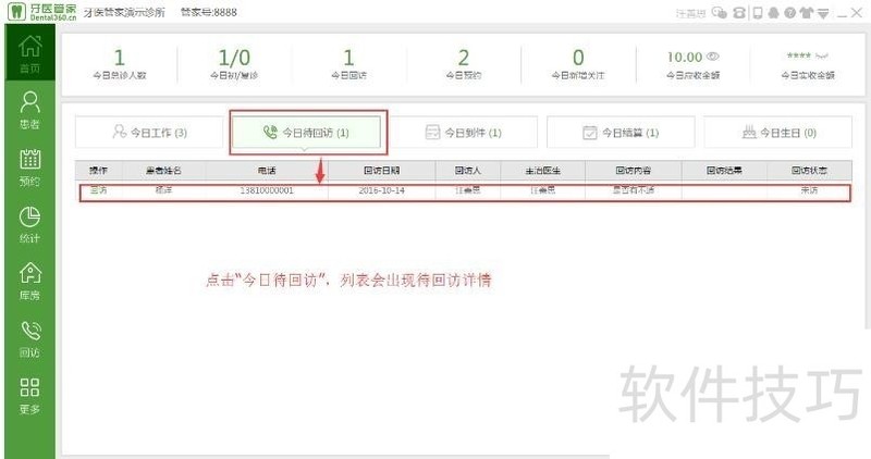 4、 今日待回访:点击“今日待回访”,列表会出现今日待回访的详情