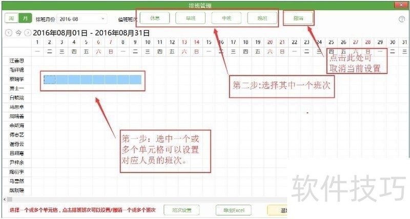3、 对医护人员进行班次设置。可选择一个单元格也可选择多个单元格。然后点击选中的班次,就可以设置当前医生的排班。