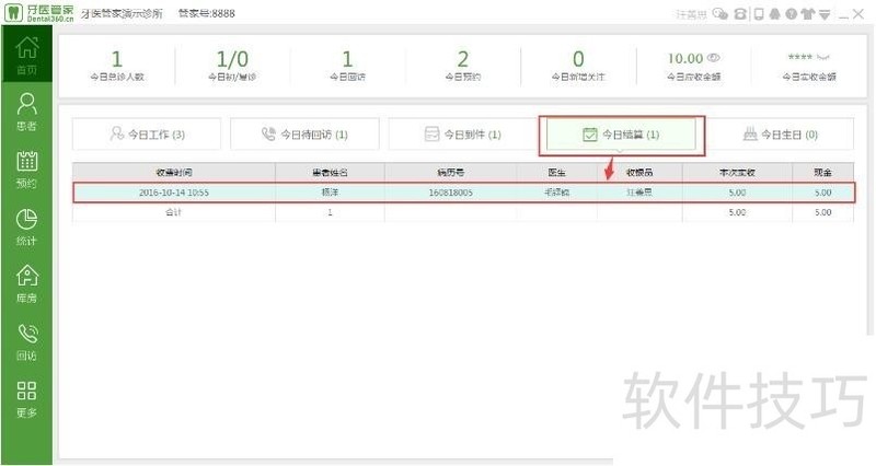 6、 今日结算:点击“今日结算”,可查看诊所今日的收费记录