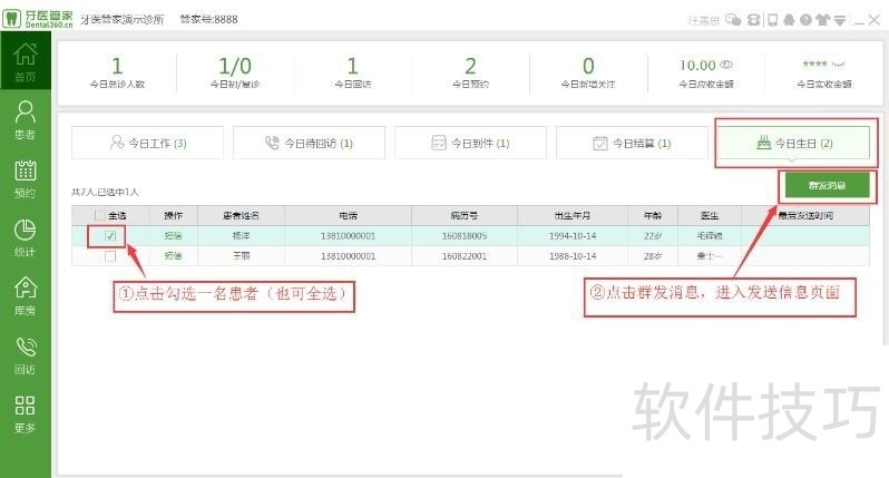 7、 今日生日:点击“今日生日”,可查看诊所中有记录出生日期的生日的患者,并对其进行群发短信送上生日祝福等。