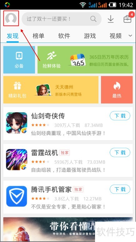 1、 首先打开手机应用宝客户端,要想知道好友们都在玩些什么应用,就得先登录应用宝才行。在主界面先点击左上角的头像图标。: