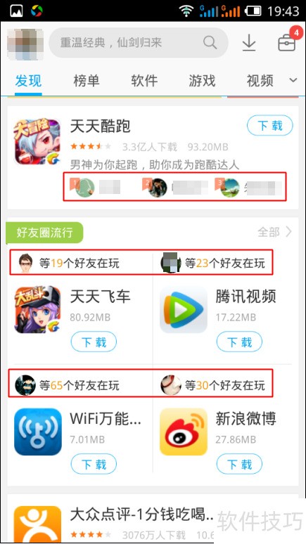 4、 成功登录账号后,在发现页面刷新一下,在好友流行圈的卡片中就可以看到都有哪些好友也在使用这些应用啦!: