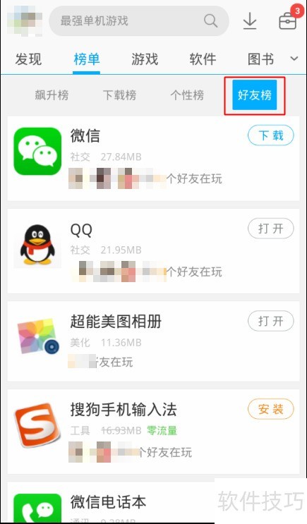 5、 进入榜单,点击进入好友榜页面,也可以看到最多好友在使用的应用。: