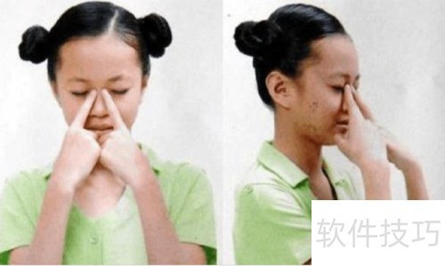 2、 第二节挤按睛明穴,用右手大拇指和食指捏住鼻子根部,先往下拉,再往上挤,来回拉挤,力度适中、速度要慢。