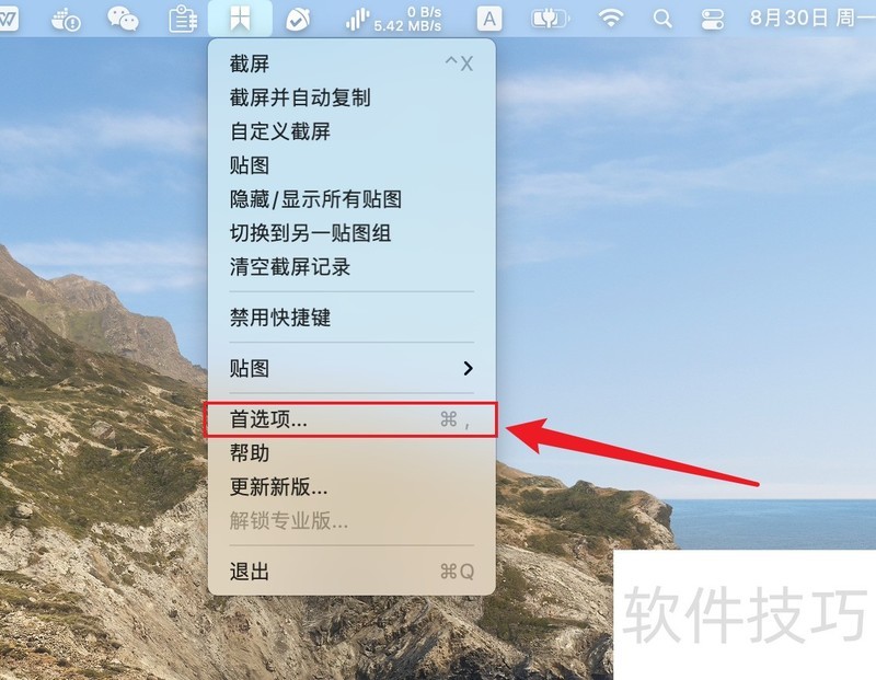 1、 打开后,点击系统菜单栏上的图标,点击‘首先项“可以进行一些设置,