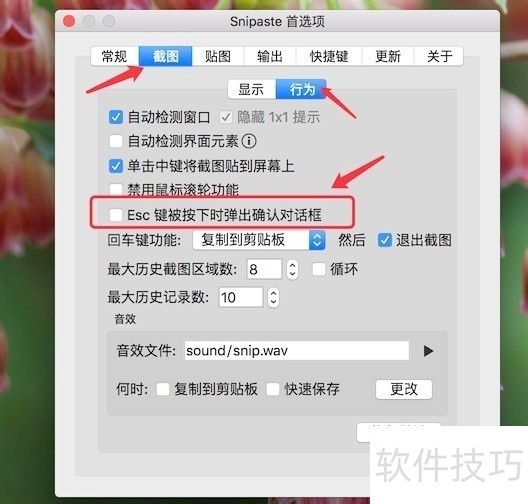 2、 在弹出的窗口上,点击‘截图’-->‘行为’,可以把如图所示的确认提示框关掉,每次按esc退出截图都弹个确认框来,实在是烦人