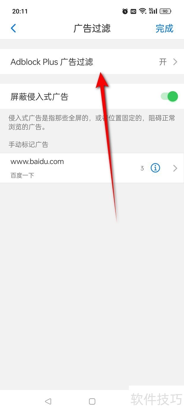 5、 将“Adblock Plus广告过滤”旁的小滑块点亮泪净即可开启。