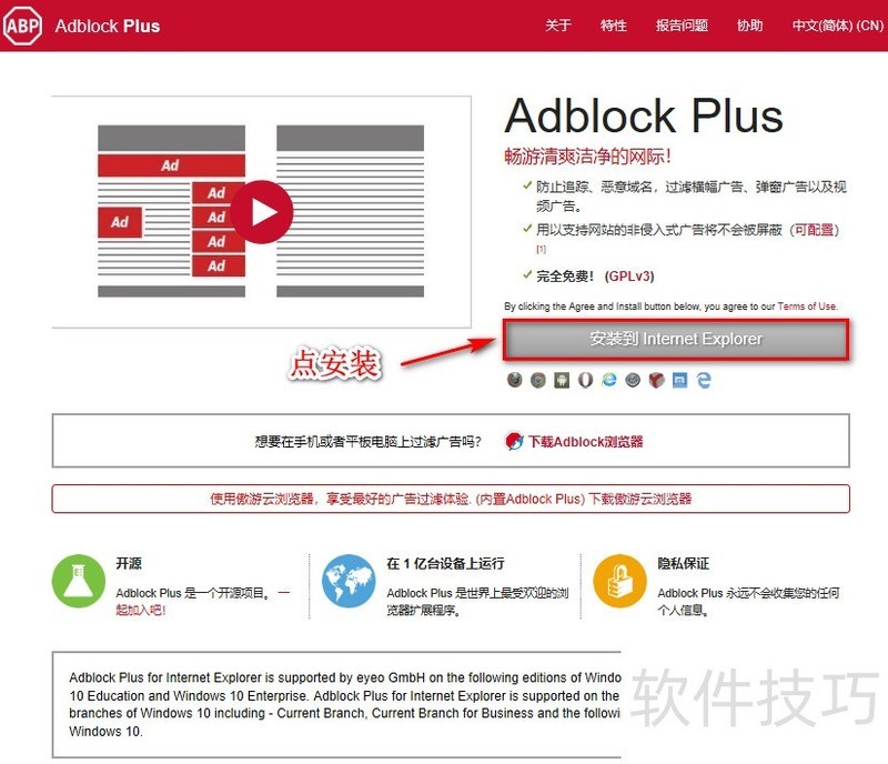 1、 打开IE浏览器,网络搜索“Adblock Plus”,进入官网主页如下图,点击途中箭头所指位置IE浏览器图标打开插件安装页面。