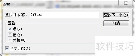 2、 F3搜索 Office, 勾选 "项“ 和全字匹配",把搜出来的所有的Office项全删了(前提以前只装了一个2007,否则只要删除里面的12.0项)