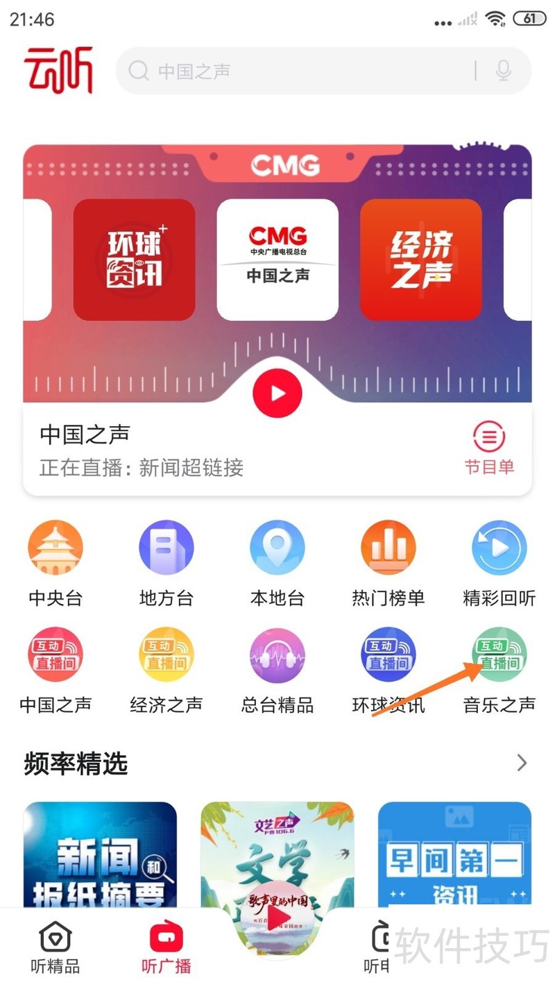 2、 在打开的听广播页面,选择上方的音乐之声选项。