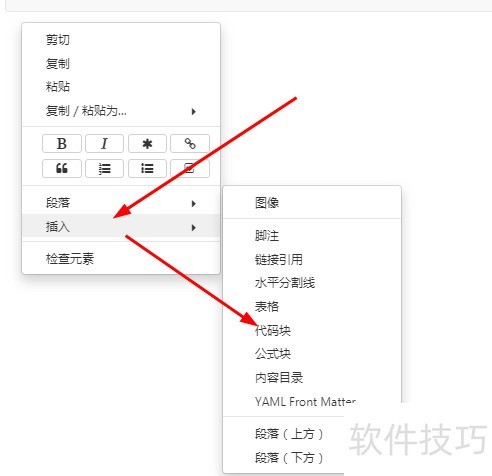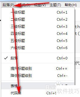 7、 还可以使用点击菜单栏 段落 -- 代码块 的方式来插入代码块?