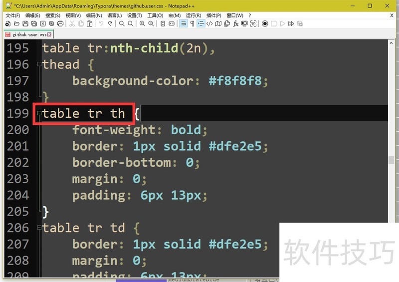 3、 打开css文件后,使用ctrl+f查找文件快速找到table tr th。