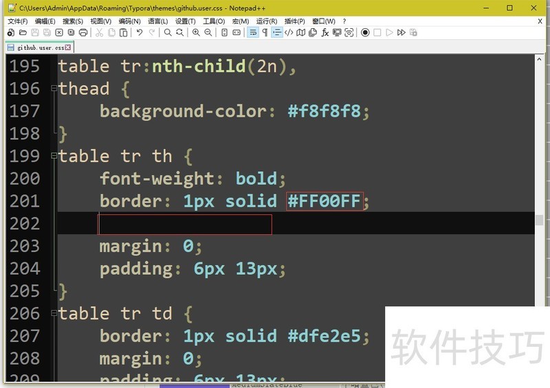 4、 在table tr th下有个border选项,我们将默认的“dfe2e5”修改为其他的16进制颜色,例如本示例中的 “FF00FF”,并删除border-bottom项。