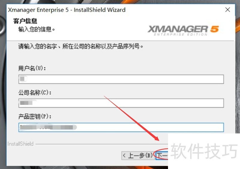 3、 填写用户名和公司名以及密钥,然后点击下一步,如下图所示。