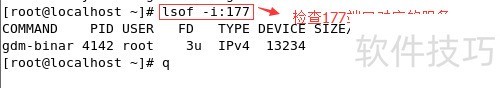 4、 检查GDM服务启动情况,上面使用的是默认的177端口,所以通过检查177端口是否开启来判断:使用命令“lsof -i:177”?