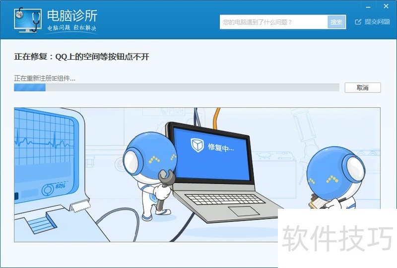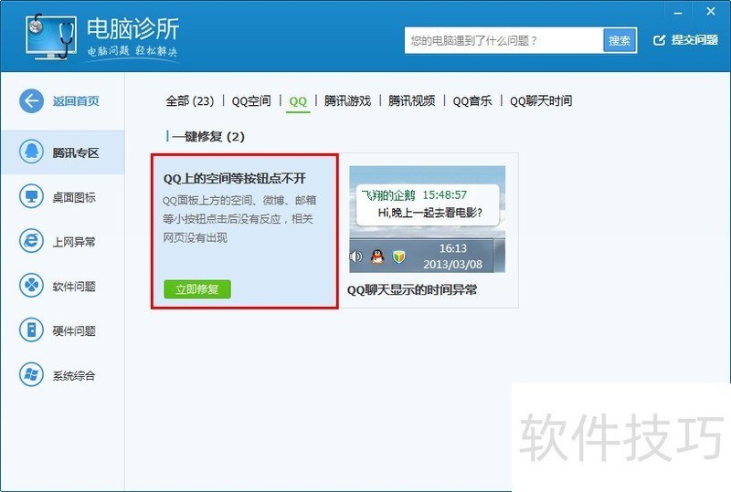 3、 0版本电脑诊所有什么新特性吗??答:8.0诊所共有3个新特性:①自助攻略通过图文的方式指导用户一步一步手动修复,图文根据用户反馈每日持续更新②搜索通过搜索快速找到修复点和自助攻略,搜索位于诊所的上方③智能探测电脑问题智能探测操作系统、软件、游戏等环境错误,实时预警提示,一键轻松解决。例如:玩游戏时系统提示dll文件缺失,下图为问题现象,智能诊疗系统将在系统错误弹窗的同时,通过tips提示用户一键修复4在诊所怎么找到我遇到的问题??答:①搜索通过首页上方的搜索框,输入搜索关键,例如输入“没有声音”,从下拉列表中找到相关问题,点击进入对应的修复?②首页标签通过点击首页标签,进入相关问题分类,例如“没有声音”可在“硬件问题-电脑没有声音”标签进入?进入标签页后找到修复点,点击进行一键修复或根据攻略手动修复?③分类通过大分类找到并解决问题,例如遇到QQ音乐、QQ登陆问题,可以从”腾讯专区”分类进入找到这些问题5怎么使用电脑诊所一键解决电脑问题??答:找到修复点点击”立即修复“按钮,进入自动修复过程,如下图: